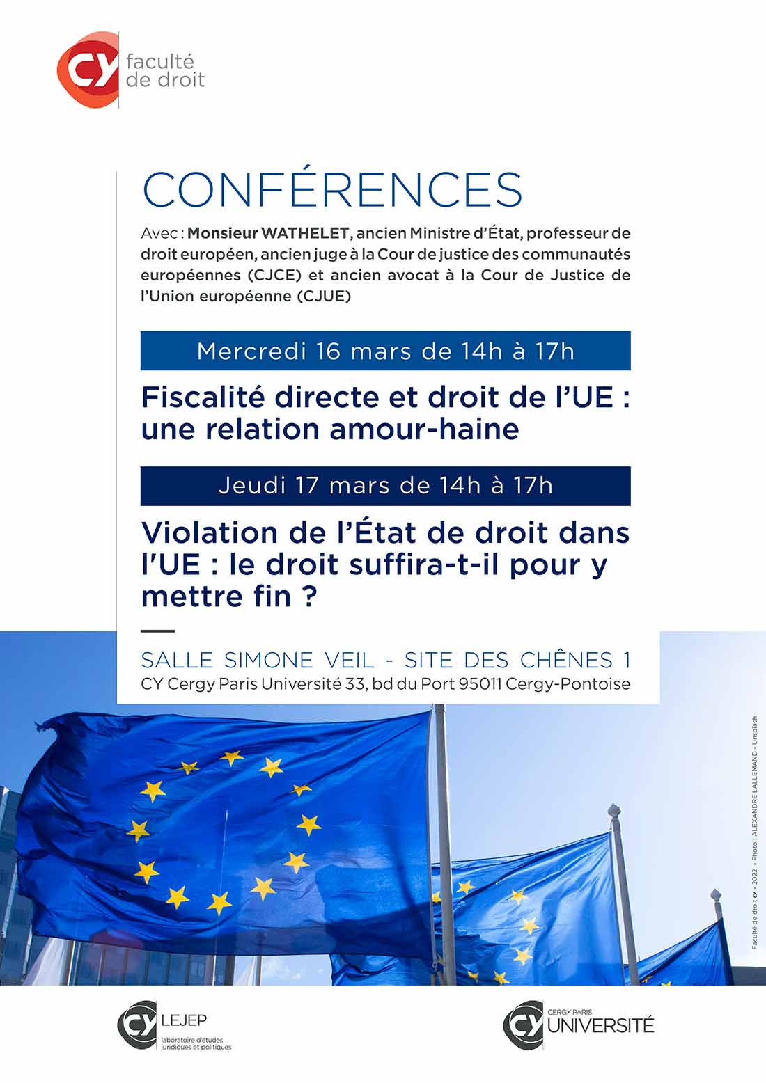 La Faculté de droit CY, le LEJEP, ainsi que l'École doctorale CY, sont honorés d'accueillir M. Melchior WATHELET, ancien Ministre d’État, professeur de droit européen, ancien juge à la Cour de justice des communautés européennes (CJCE) et ancien avocat à la Cour de Justice de l’Union européenne (CJUE).