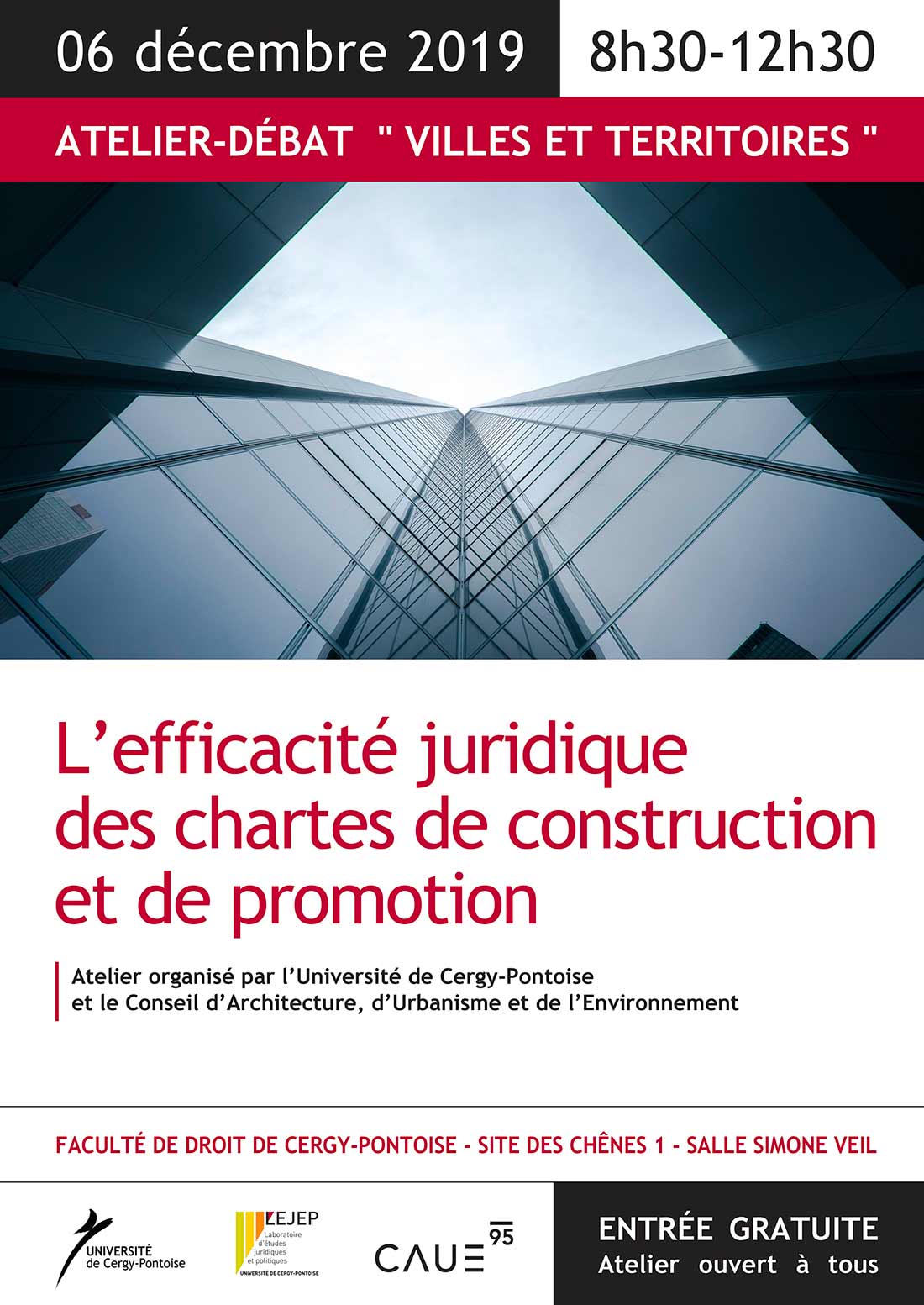 L'Université de Cergy-Pontoise et le Conseil d'Architecture, d'Urbanisme et de l'Environnement (CAUE) du Val d'Oise organisent le 6 décembre 2019 une matinée d'atelier débat relative aux « Chartes promoteurs ».