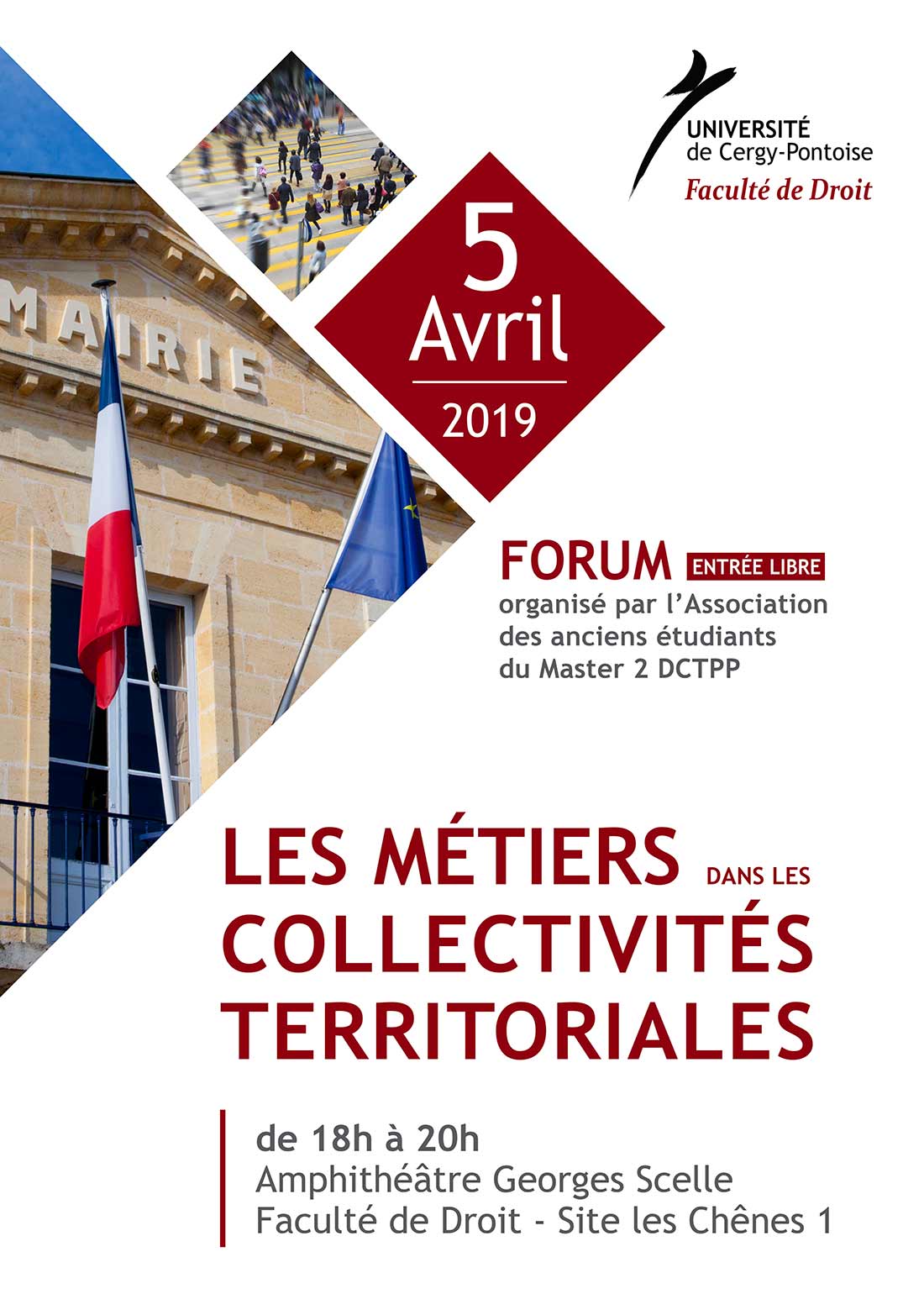 Le vendredi 05 avril 2019, la Faculté de Droit et l’Association des anciens étudiants du Master 2 DCTPP organisent un Forum autour des "Métiers dans les collectivités territoriales".