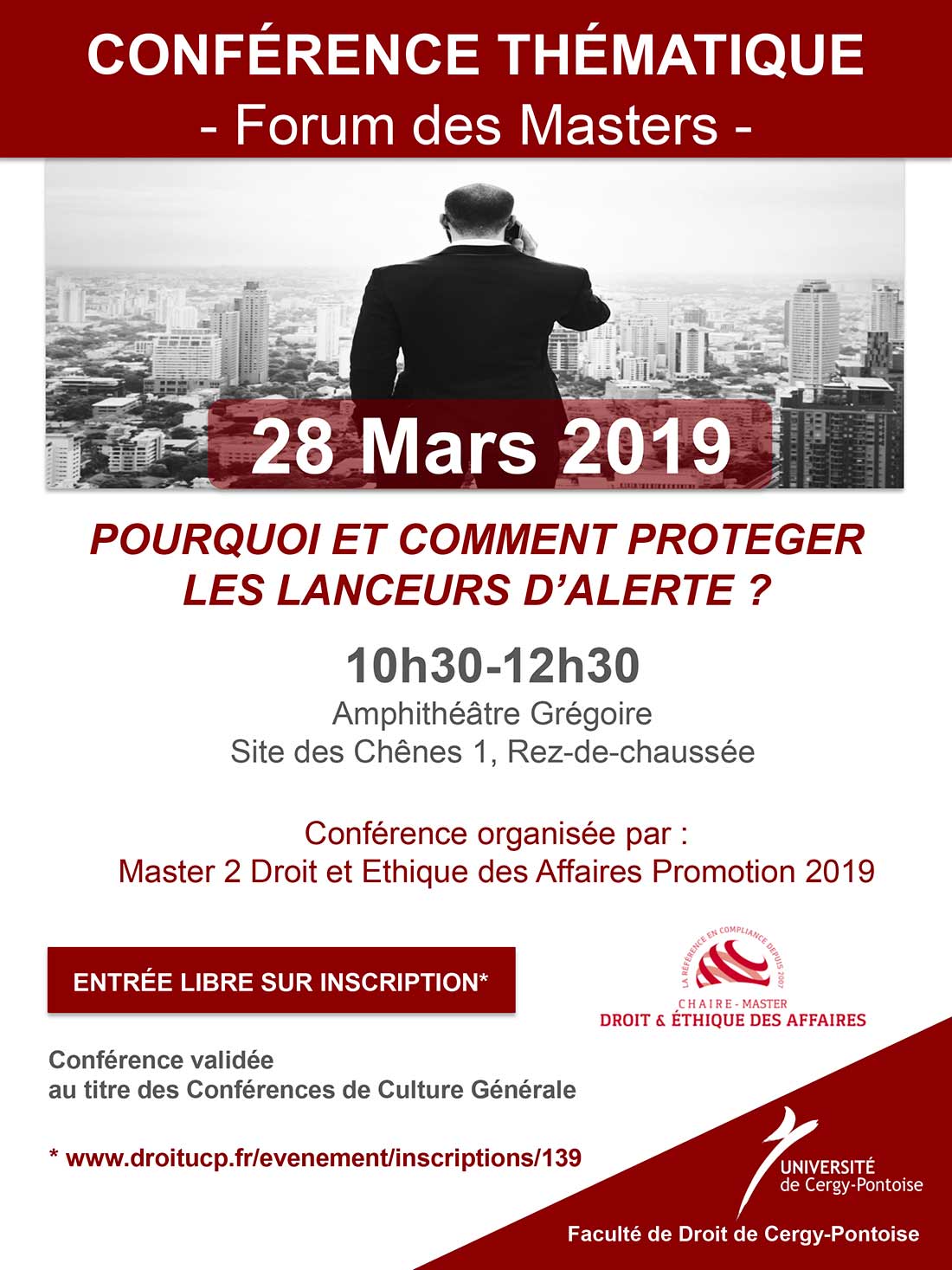 Le Master 2 Droit et Ethique des Affaires organise une conférence thématique le 28 Mars 2019 : "Pourquoi et comment protéger les lanceurs d'alerte ?".