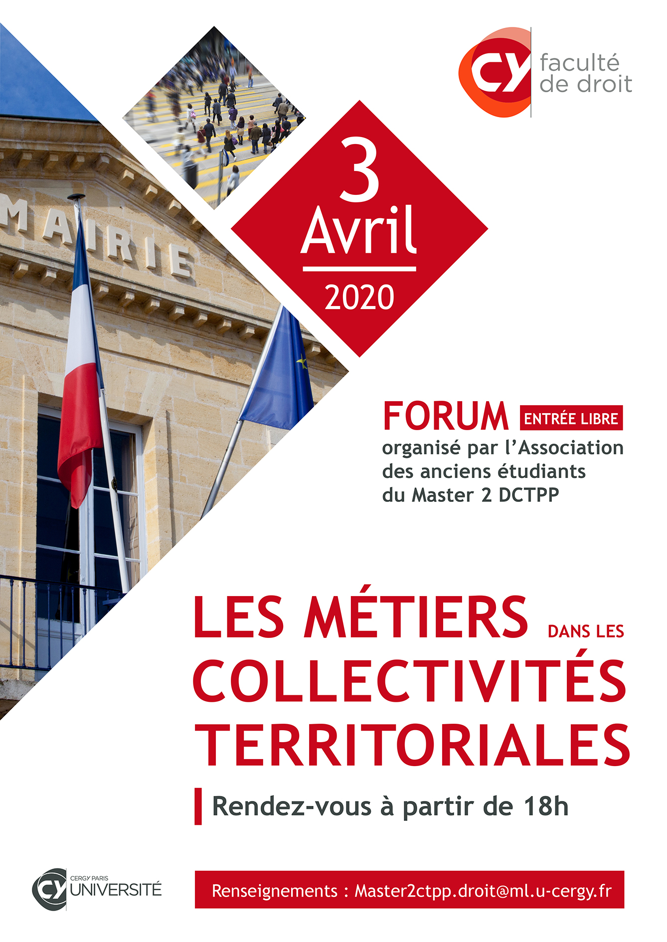 Le vendredi 03 avril 2020, la Faculté de droit et l’Association des anciens étudiants du Master 2 DCTPP organisent un Forum autour des "Métiers dans les collectivités territoriales".