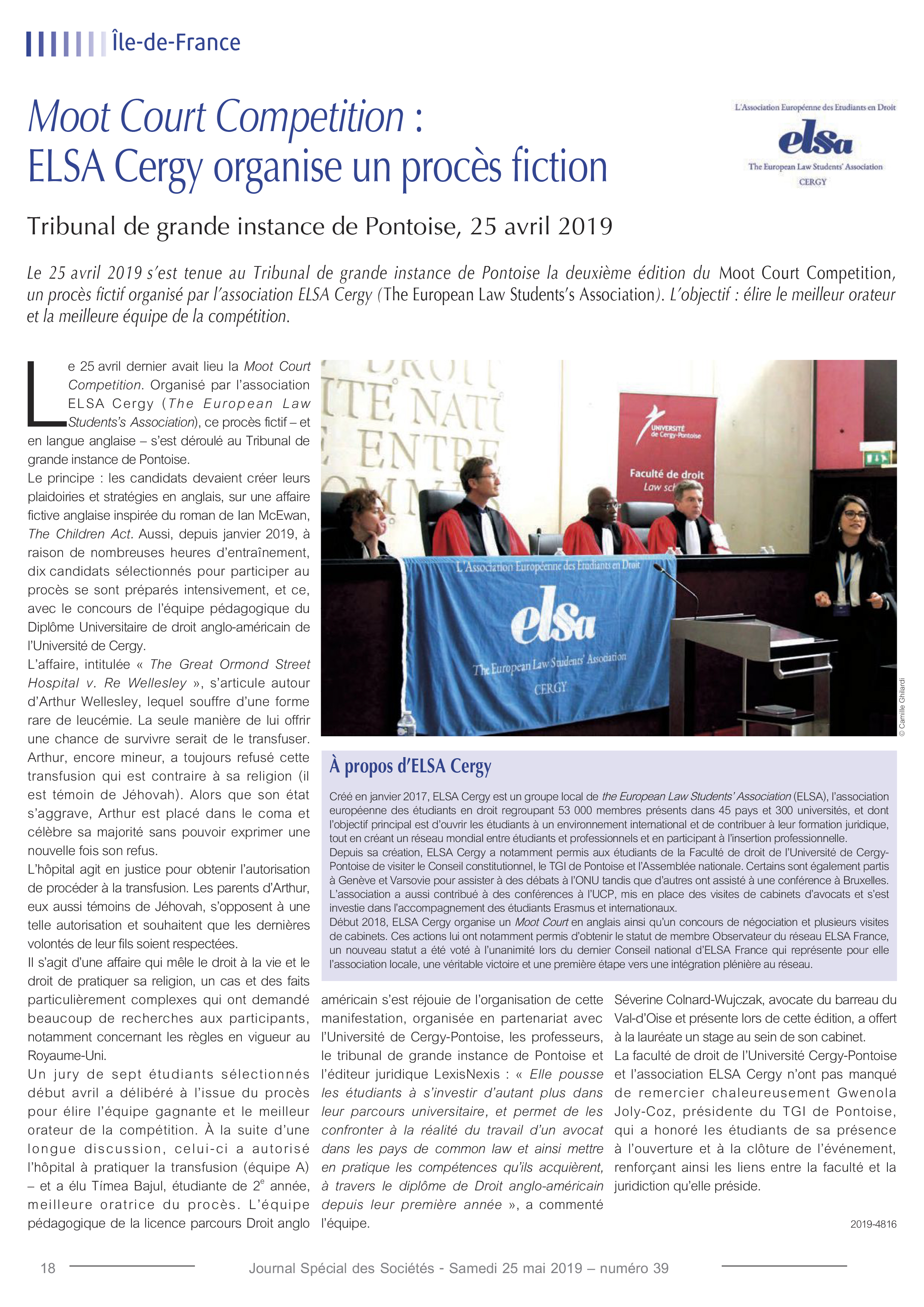 La deuxième édition du procès fictif «Moot Court Competition» de l’association ELSA CERGY (The European Law Students’s Association) s’est déroulée le 25 avril 2019 au Tribunal de Grande Instance de Pontoise.