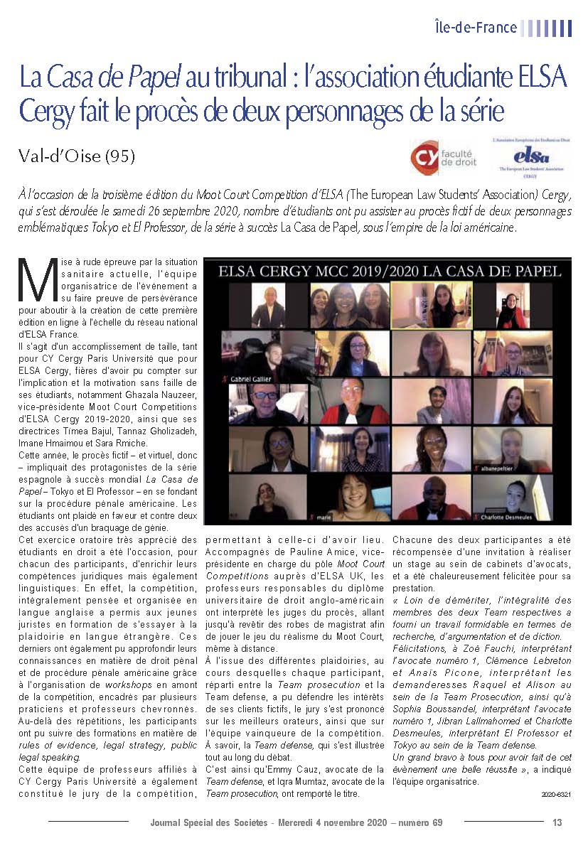 La troisième édition du procès fictif «Moot Court Competition» de l’association ELSA Cergy (The European Law Students’s Association) s’est tenue le 26 septembre 2020.